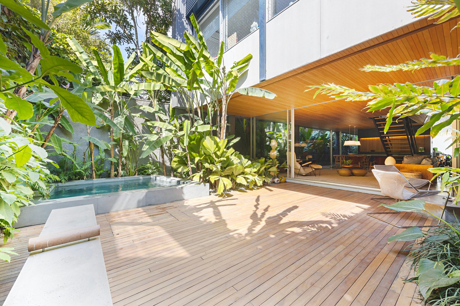 Esse modelo também valoriza a conexão com o exterior. Grandes painéis de vidro aproximam jardim e living, trazendo mais verde para dentro de casa. Assim, os limites entre dentro e fora ficam cada vez mais sutis.