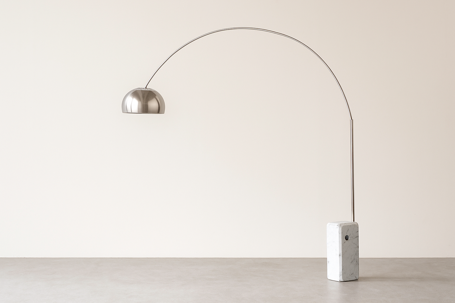 Inspirada no poste de rua e projetada em 1962, a Luminária Arco é uma escultura em si. Sua base em mármore e arco de aço curvado criam uma iluminação cênica e sofisticada, ideal para áreas sociais amplas.